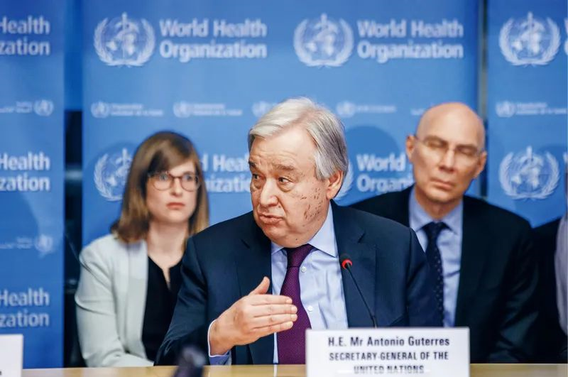 2020年2月24日,联合国秘书长古特雷斯(前)在瑞士日内瓦世界卫生组织总部发表讲话。古特雷斯表示,中国实施严格的防控措施,以牺牲正常生活的方式为全人类作出了贡献。古特雷斯当日造访日内瓦世卫组织总部,并与世卫组织各部门负责人举行座谈。新华社发