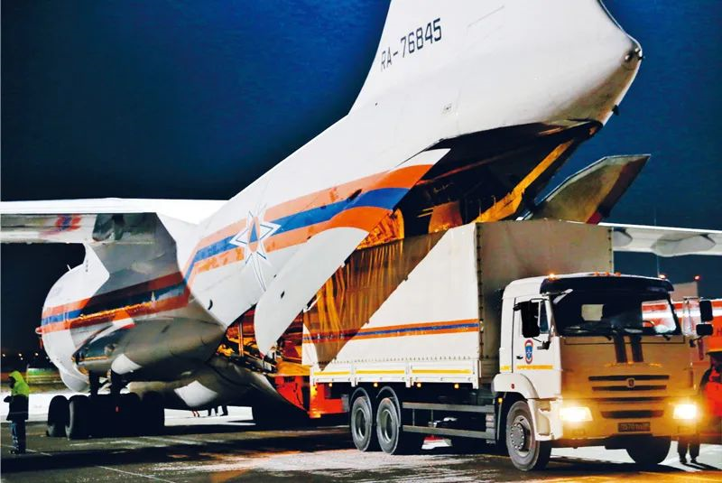 2020年2月8日,在俄罗斯莫斯科附近的茹科夫斯基机场,工作人员将俄罗斯政府向中方提供的医疗援助物资装上运输机。新华社/卫星社