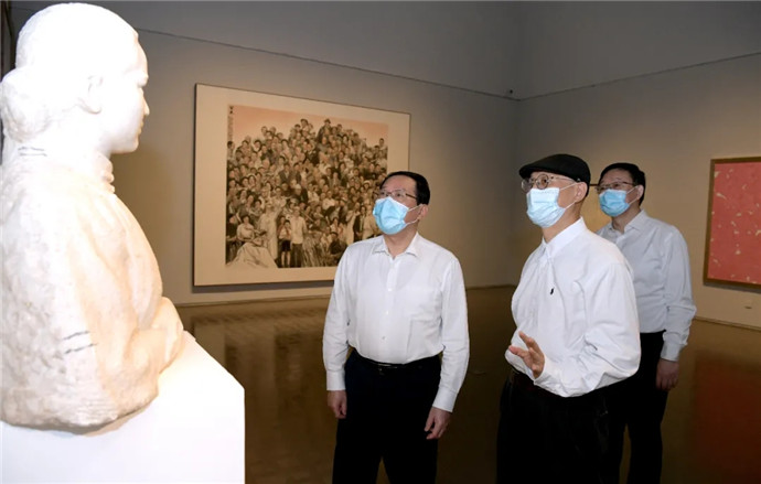 市领导在一幅幅党史主题和时代主题作品前驻足,听取关于作品构思、创作过程和表现手法等情况介绍,就重大主题美术创作同相关艺术家作了交流讨论。